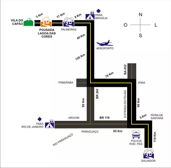 • A partir de Salvador: pela Estrada de Feijão (BA 052) ou pela BR 116 – veja mapa abaixo