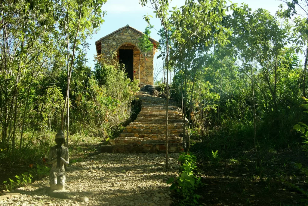 Silenciar, meditar ou estar em oração em um templo no meio da natureza.